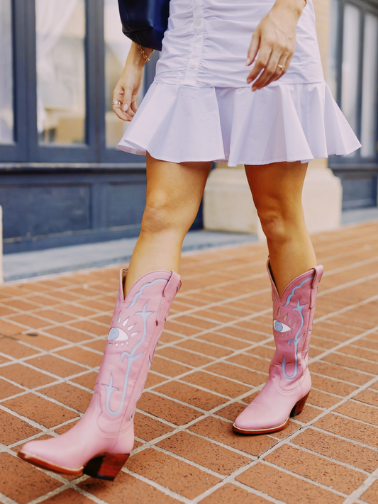 Pink Evil Eye Inlay Almond-Toe Wide Calf Knee High Western Cowgirl Tall Boots