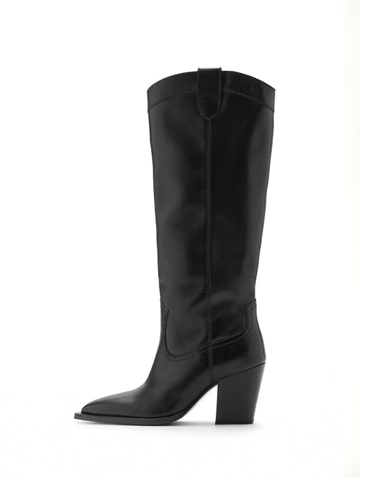 Black Pointed-Toe Knee High Simple Wide Calf Cowgirl Boots