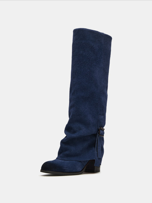 Purplish Blue Faux Suede Round-Toe Fold-Over Adjustable Buckle Knee High Cowgirl Boots