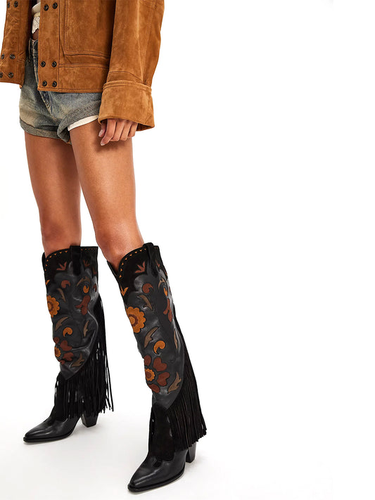 Black Pointed-Toe Faux Suede Flowers Inlay Fringe Knee High Cowgirl Boots