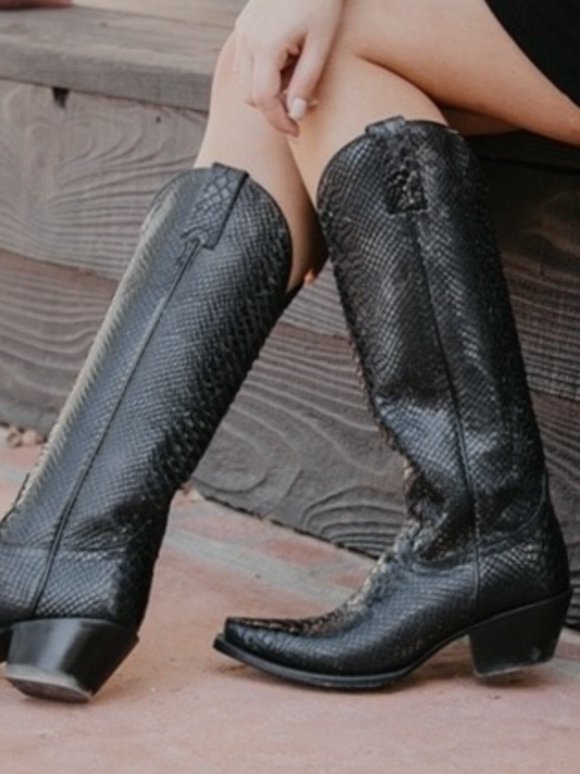Black Snakeskin Snip-Toe Wide Knee High Tall Cowgirl Boots