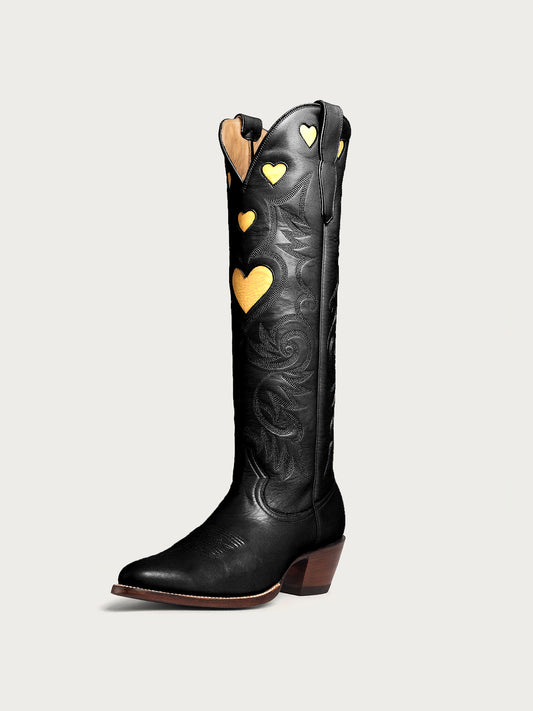 Gold Heart Inlay Embroidery Almond-Toe Tall Wide Knee High Cowgirl Boots - Black