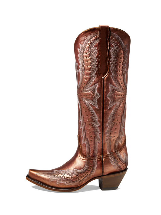 Metallic Rose Gold Snip-Toe Studded Embroidery Wide Knee High Cowgirl Boots