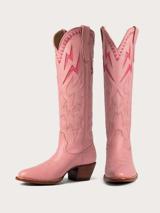 Lightning Inlay Stitch Embroidery Almond-Toe Wide Knee High Cowgirl Boots - Pink