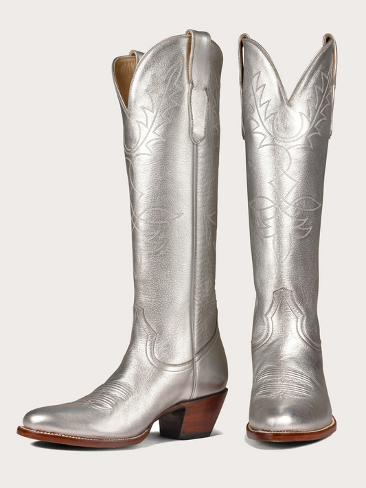 Metallic Silver Round-Toe Embroidery Wide Knee High Western Boots
