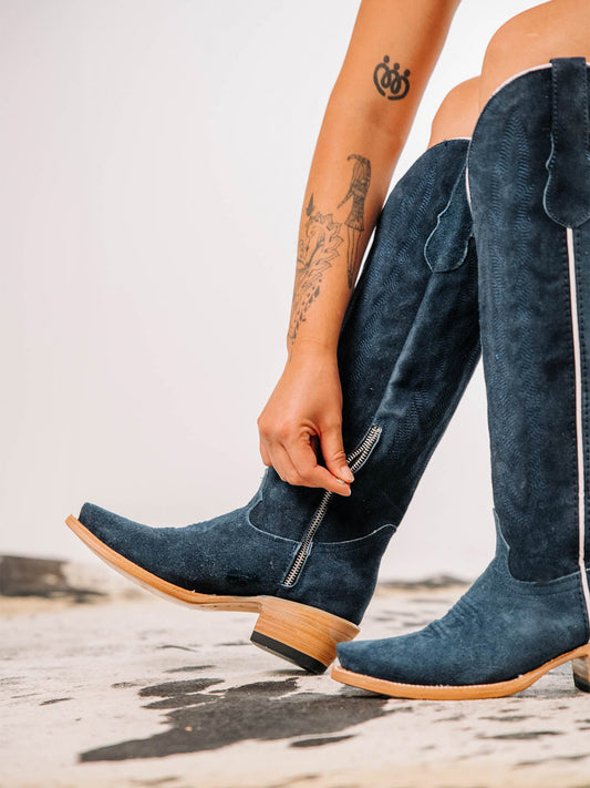 Midnight Blue Faux Suede Snip-Toe Embroidery Half-Zip Classic Knee High Cowgirl Boots