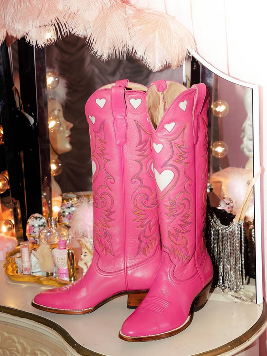Ivory Heart Inlay Embroidery Almond-Toe Knee High Wide Calf Cowgirl Boots - Hot Pink