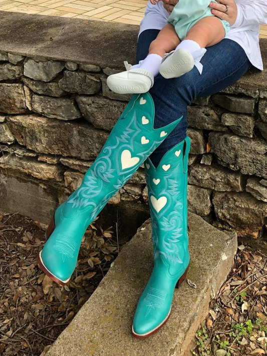 Ivory Heart Inlay Embroidery Almond-Toe Knee High Wide Calf Cowgirl Boots - Turquoise