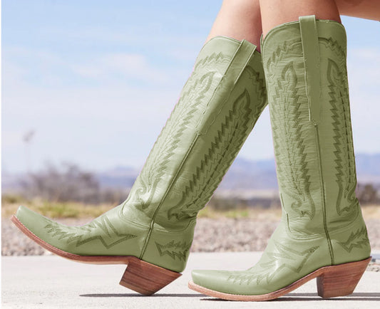 Snip-Toe Embroidery Wide Calf Knee High Tall Cowgirl Boots - Light Green