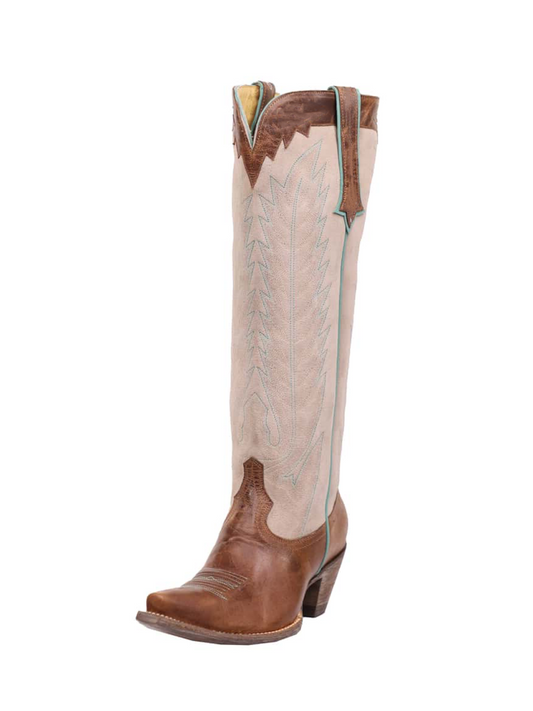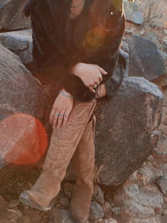 Contrast Oatmeal Faux Suede And Brown Snip-Toe Embroidery Wide Calf Knee High Cowgirl Boots