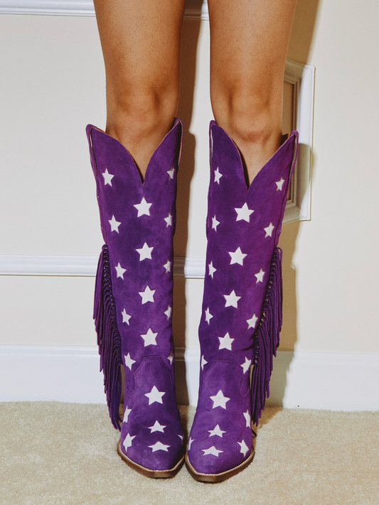 Fringe Faux Suede Snip-Toe Stars Inlay Wide Calf Knee High Cowgirl Boots - Purple