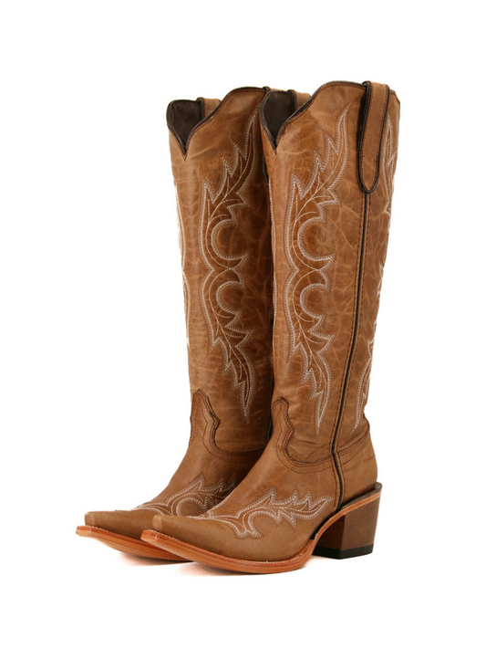Distressed Dark Tan Snip-Toe Half-Zip Classic Embroidery Knee High Tall Cowgirl Boots
