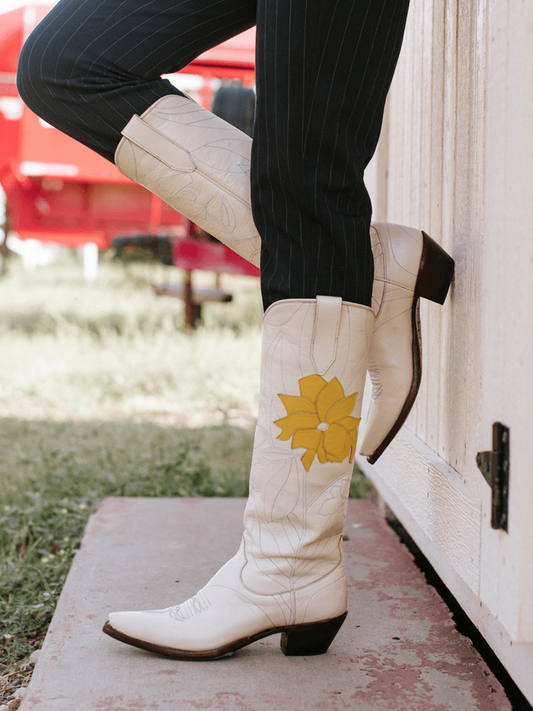 Cream Snip-Toe Embroidery Flower Applique Wide Calf Knee High Cowgirl Boots