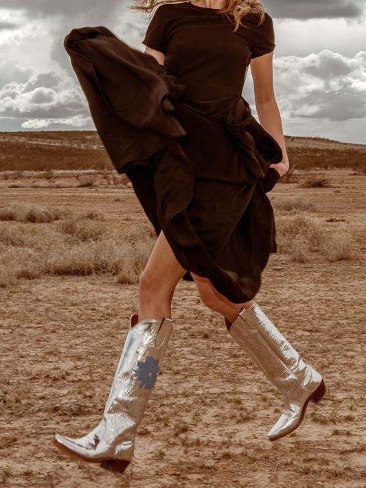 Metallic Silver Snip-Toe Embroidery Flower Applique Wide Calf Knee High Cowgirl Boots