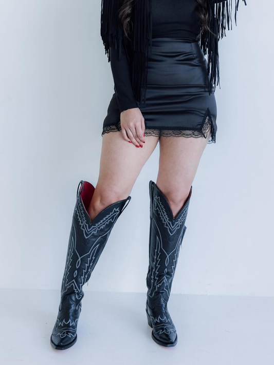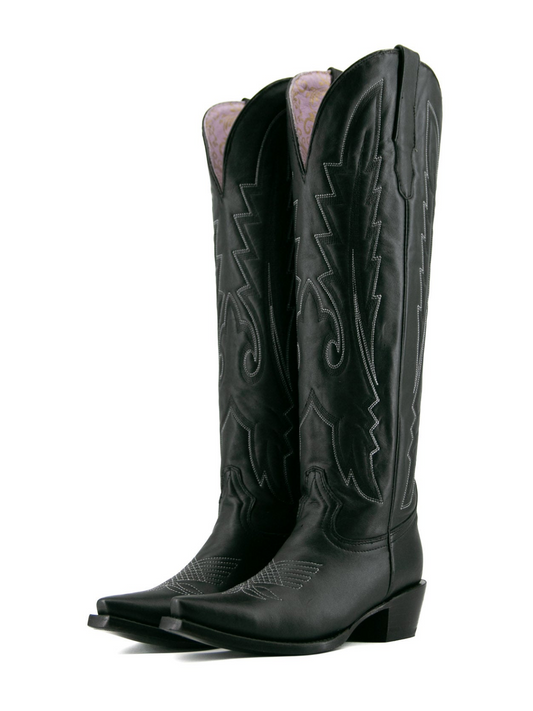 Black Snip-Toe Classic Embroidery Half-Zip Knee High Cowgirl Boots