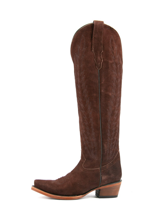Faux Suede Snip-Toe Half-Zip Embroidery Knee High Tall Cowgirl Boots - Cafe