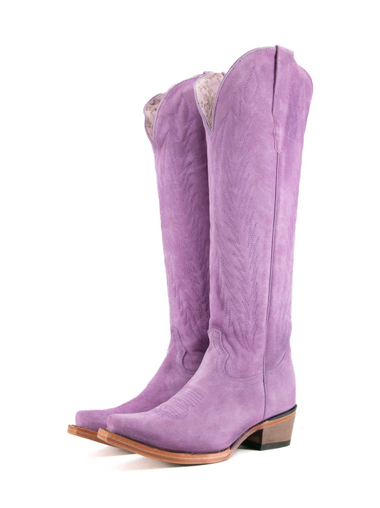 Faux Suede Snip-Toe Half-Zip Embroidery Knee High Tall Cowgirl Boots - Purple