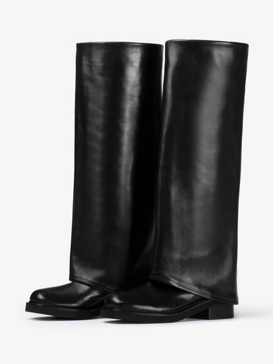 Black Square-Toe Fold-Over Wide Calf Tall Knee High Cowgirl Boots