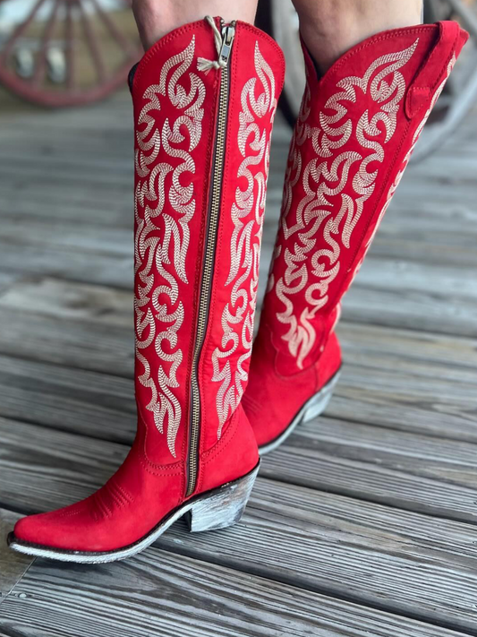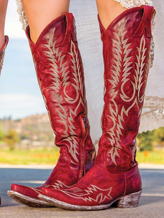 Embroidery Almond-Toe Full-Zip Knee High Tall Cowgirl Boots - Red