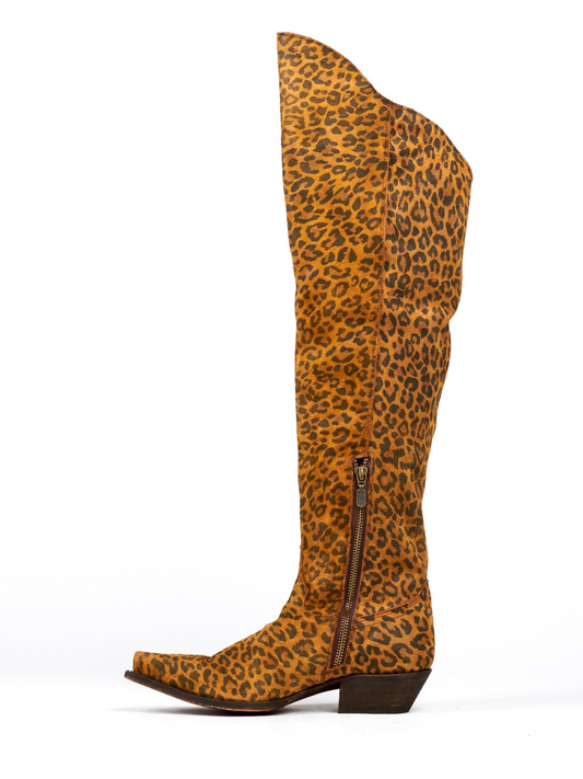 Leopard Snip-Toe Scalloped Top Half-Zip Tall Knee High Cowgirl Boots