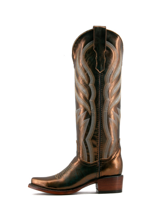 Metallic Bronze Snip-Toe Embroidery Wide Calf Tall Knee High Cowgirl Boots
