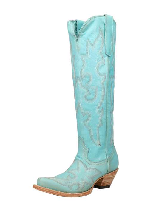 Ice Blue Embroidery Snip-Toe Wide Calf Tall Knee High Cowgirl Boots