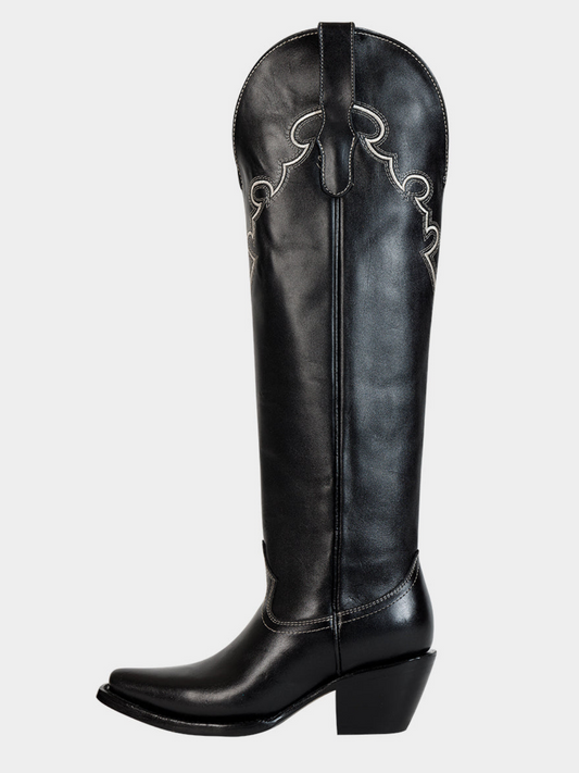 Black Snip-Toe Embroidery Wide Calf Tall Knee High Cowgirl Boots
