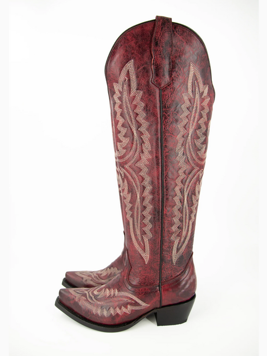 Distressed Scarlet Embroidery Snip-Toe Half-Zip Cowgirl Knee High Tall Boots