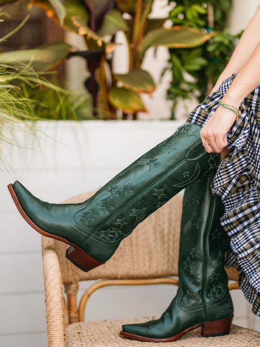 Moon Star Inlay Applique Knee High Cowgirl Tall Boots - Green