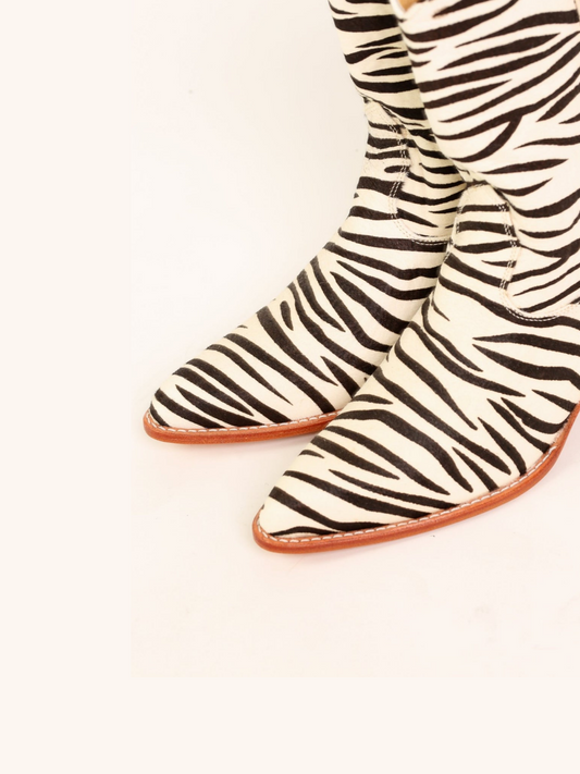 Faux Zebra Print Pony Hair Almond-Toe Back-Zip Mid Calf Cowgirl Boots