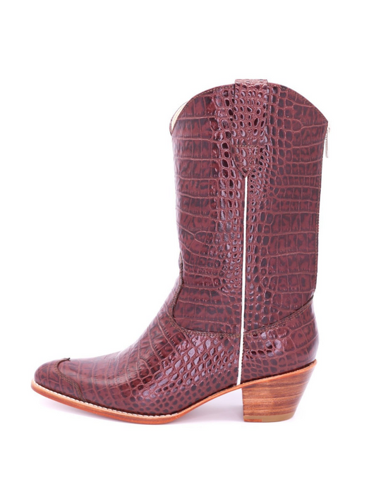 Red Crocodile-Embossed Vegan Leather Almond-Toe Back-Zip Mid Calf Cowgirl Boots