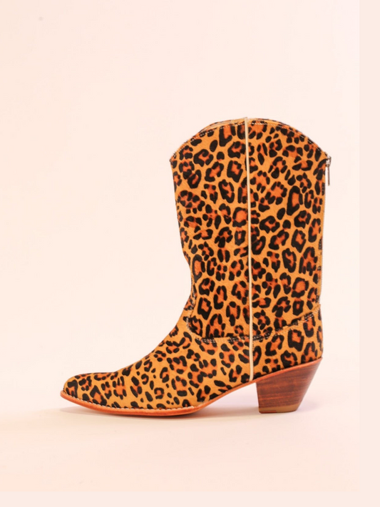 Faux Leopard Print Pony Hair Almond-Toe Back-Zip Mid Calf Cowgirl Boots