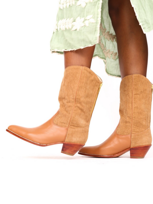 Orange Striped Velveteen And Vegan Leather Almond-Toe Back-Zip Mid Calf Cowgirl Boots