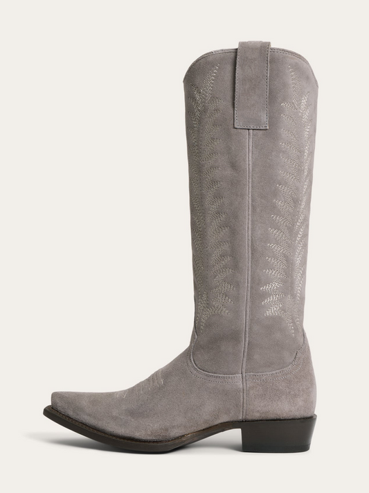 Gray Faux Suede Snip-Toe Classic Embroidery Wide Mid Calf Tall Cowgirl Boots