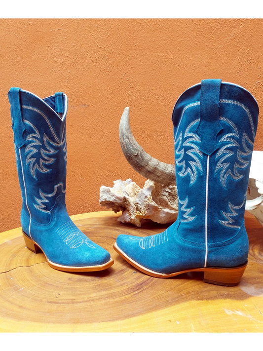 Blue Faux Suede Snip-Toe Classic Embroidery Mid Calf Cowgirl Boots