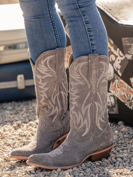 Faux Suede Wings Embroidery Pointed-Toe Wide Mid Calf Tall Cowgirl Boots - Gray