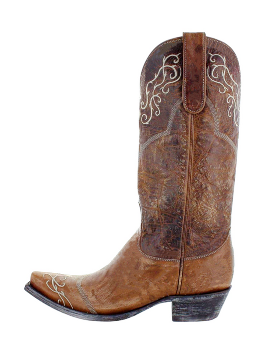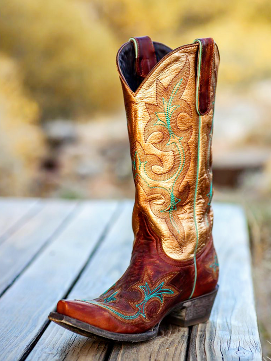 Contrast Distressed Brown And Metallic Gold Snip-Toe Embroidery Mid Calf Tall Cowgirl Boots