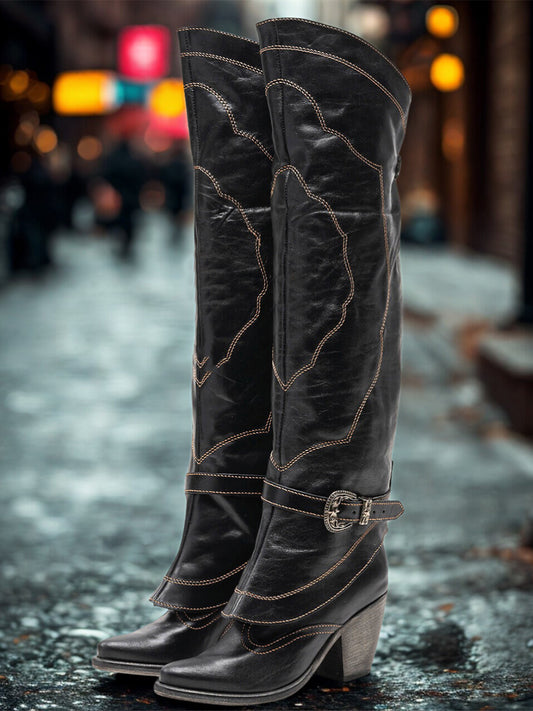 Black Snip-Toe Fold-Over Buckle Strap And Stitch Wide Calf Knee High Cowgirl Boots