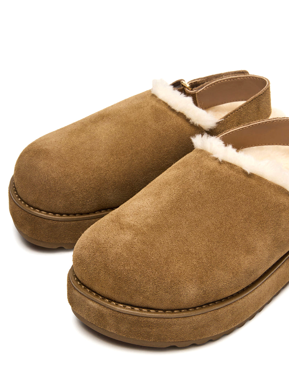 Cognac Faux Suede Round-Toe Slingback Platform Shoes With Faux Fur