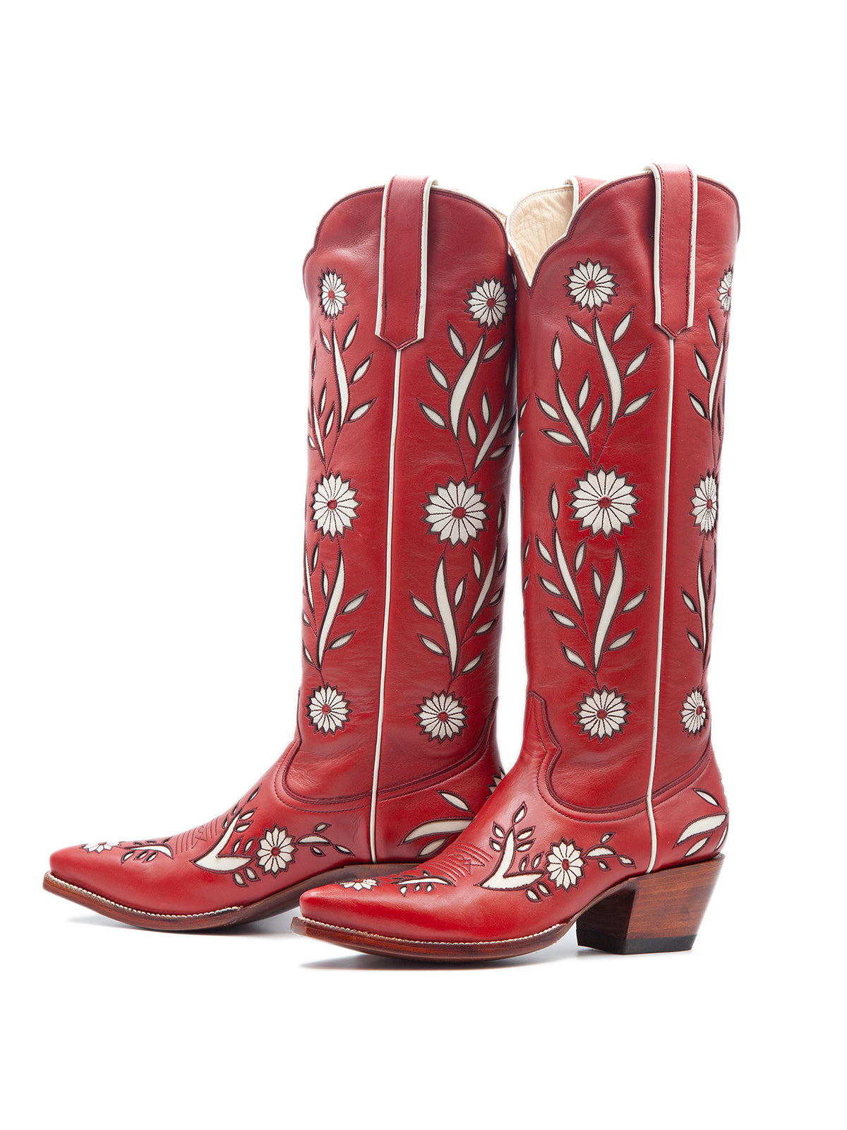Red Pointed-Toe White Sunflower Inlay Wide Calf Knee High Cowgirl Boots