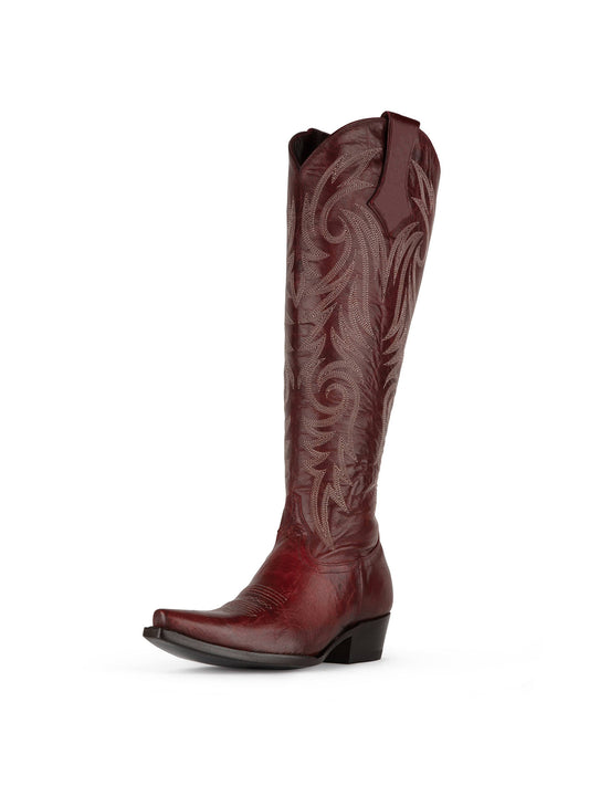 Dark Red Snip-Toe Classic Embroidery Western Half-Zip Knee High Cowgirl Boots
