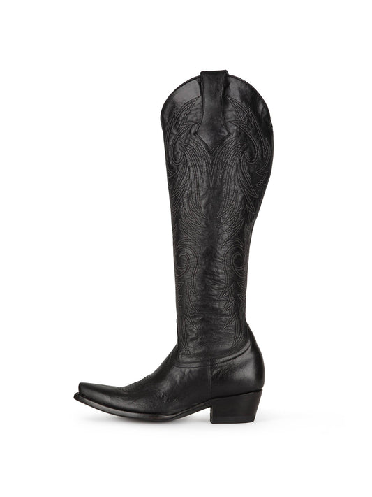 Black Snip-Toe Classic Embroidery Western Half-Zip Knee High Cowgirl Boots