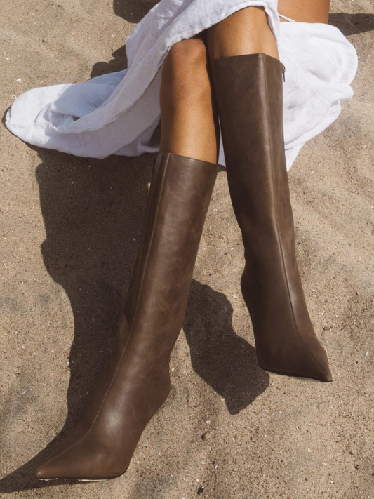Distressed Taupe Pointed-Toe Full-Zip Mid Calf Stiletto Boots