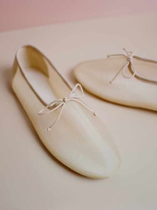 Beige Mesh Super Cute Bow Ballet Flats With Almond Toe