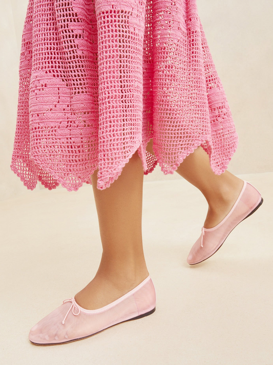 Pink Mesh Super Cute Bow Ballet Flats With Almond Toe