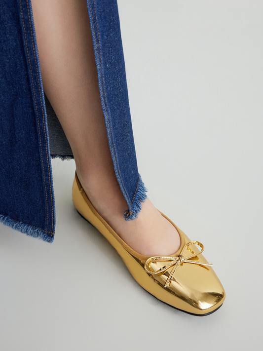 Gold Bow Ballet Flats With Square Toe In Mirror-Finish Metallic Vegan Leather