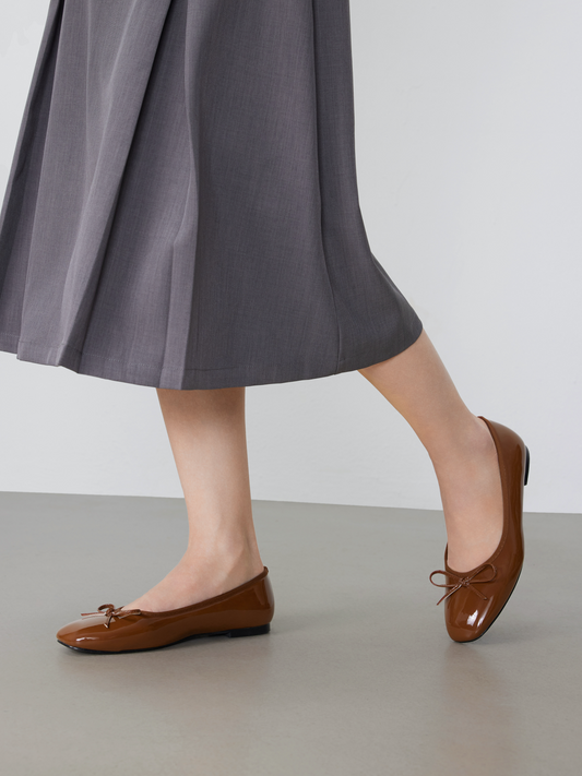 Brown Bow Ballet Flats With Square Toe In Patent Vegan Leather