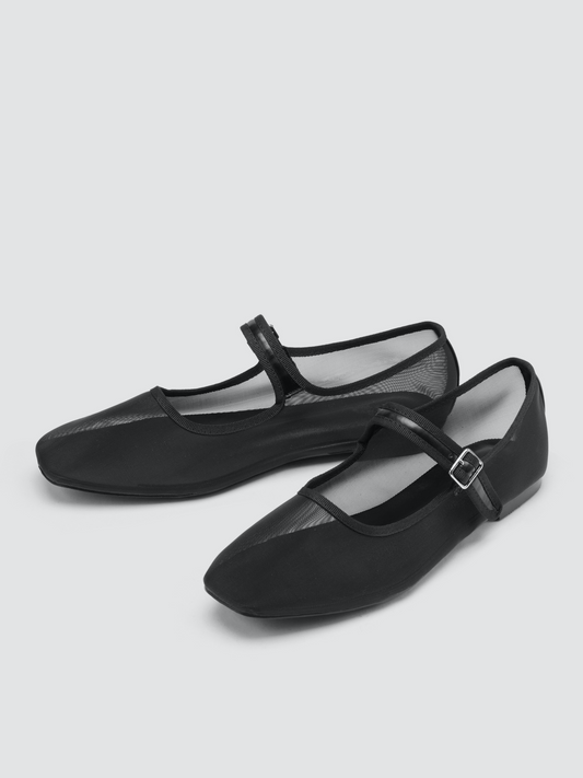 Black Mesh Square-Toe Ballet Flats Mary Janes With Buckled Strap