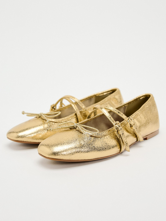 Metallic Gold Crinkle Bow Ballerina Flats Mary Janes With Thin Crossed Buckled Strap