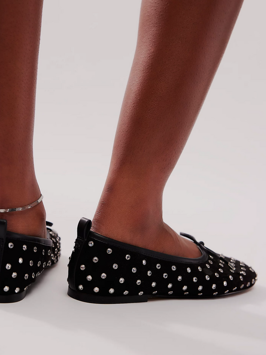 Black Sparkle Rhinestone Fabric Bow Ballet Flats With Slightly Square-Toe